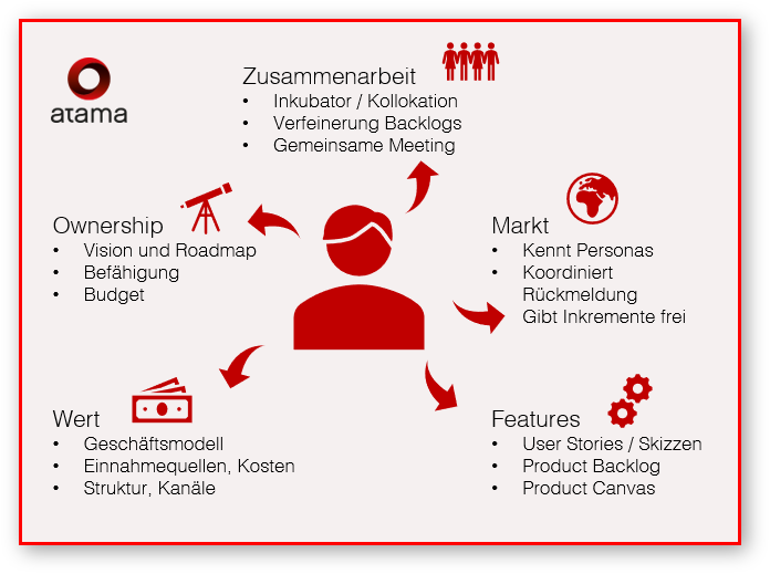 Der Product Owner ist dafür verantwortlich die Kundenbedürfnisse zu verstehen und diese richtig zu kommunizieren. Er agiert als Bindeglied und muss in der Lage sein, eine Produktvision zu erstellen und den Mehrwert der neuen Softwareversion und den Business-Nutzen klar zu bestimmen. Der Product Owner ist für das Erstellen der Anforderungen, Priorisieren und Pflegen des Produkt-Backlog verantwortlich. Neue Anforderungen werden kontinuierlich in das Produkt-Backlog aufgenommen und existierende Anforderungen verfeinert. Um sicherzustellen, dass die Kundenbedürfnisse richtig verstanden werden, muss der Product Owner ständig den Kontakt zu Kunden und Anwendern pflegen. Zusätzlich managt er die verschiedenen Stakeholder wie Marketing, Vertrieb, Service und erfasst ihre Bedürfnisse.