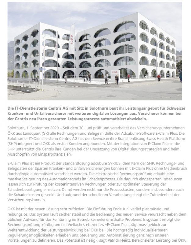 Mitte 2018 wurden wir mit der Gesamtprojektleitung E-Claim Plus für die Digitalisierung bei einem nationalen Gesundheitsversicherer beauftragt. Ende Juni 2020 konnten wir das Digitalisierungsprojekt erfolgreich abschliessen. Lesen Sie den gesamten Presseartikel: